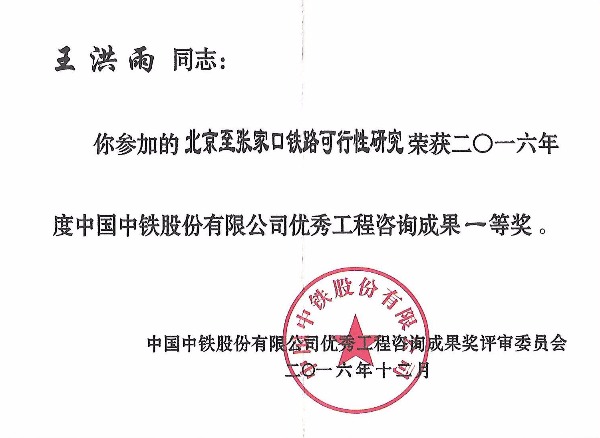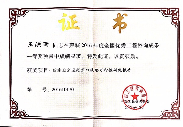| 2016年 | 中国中铁股份有限公司 | 优秀工程咨询成果一等奖 |