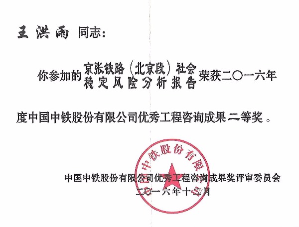 | 2016年 | 中国中铁股份有限公司 | 优秀工程咨询成果二等奖 |