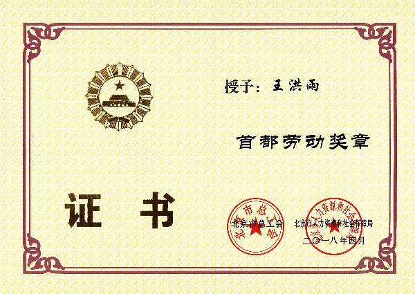 | 2018年 | 北京市总工会、北京市人力资源和社会保障局 | 首都劳动奖章 |