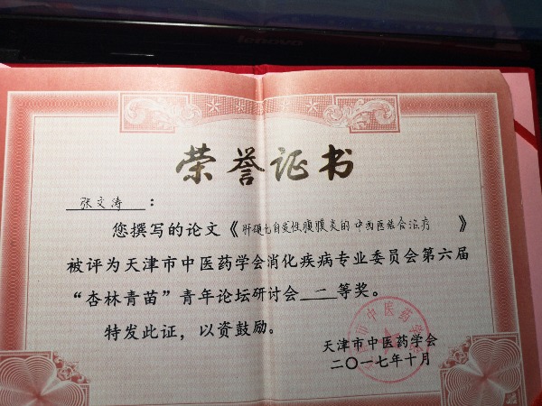 | 2017年 | 天津市中医药学会 | 天津市中医药学会消化疾病专业委员会第六届“杏林青苗”青年论坛研讨会一等奖 |