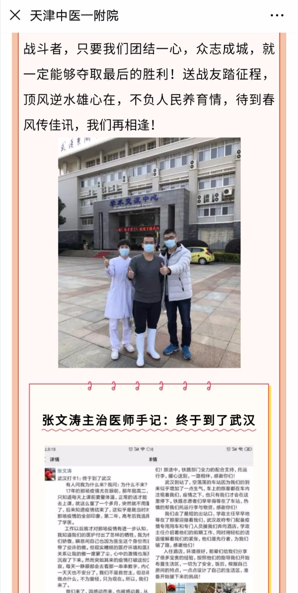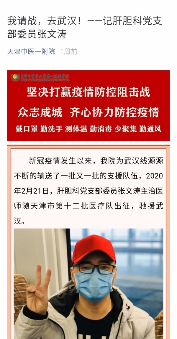 新冠疫情发生以来,全国各地医疗机构为武汉前线源源不断的输送了一批又一批的支援队伍,2020年2月21日,天津中医药大学第一附属医院肝胆科党支部委员张文涛主治医师随天津市第十二批医疗队出征,驰援武汉。