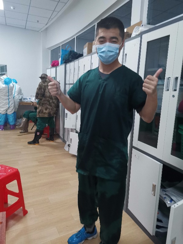 张文涛医生来到了武汉,因感动而来,也被感动着。医院尽最大努力保护好医护人员,要求每个人反复练习穿脱防护服,培训各种防护知识,为进舱做充足准备。在紧张的培训了两天后,医护人员开始进入工作状态。每一次进舱都是对身体和心理承受能力的考验,因避免上厕所,进舱前会进行限水,同时舱内温度偏高,防护服密不透气,造成体内严重缺水,甚至脱水。每次出舱后,衣服早已被汗水浸透,口干咽燥。严密的防护必然带来氧气供应的减少,持续工作几个小时,头晕、胸闷、心慌、耳鸣这些症状陆续出现,新鲜的空气是多么被需要。也正是此时,张文涛想到了来一线的初衷,不就是为了能让更多的人在新鲜的空气中畅快的呼吸吗?初心如磐,责任在肩。他坚持了下来,努力地去调整、去适应,保证自己以最好的状态去为舱内的患者做好诊疗服务。