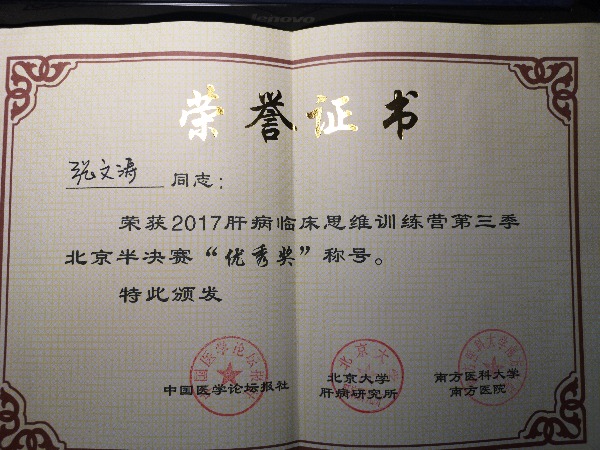 | 2017年 | 中国医学论坛报社、北京大学肝病研究所、南方医科大学南方医院 | 2017年肝病临床思维训练营第三季北京半决赛优秀奖 |