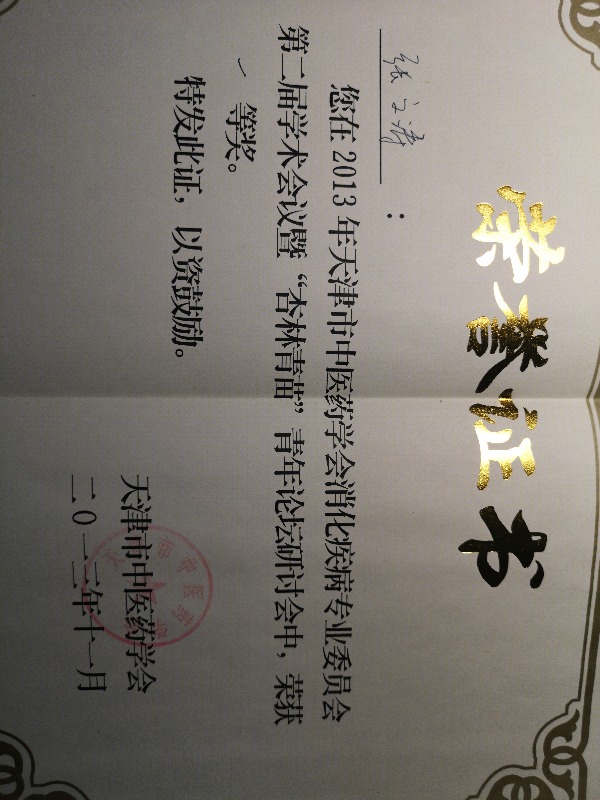 | 2013年 | 天津市中医药学会 | 天津市中医药学会消化疾病专业委员会第二届学术会议暨“杏林青苗”青年论坛研讨会一等奖 |