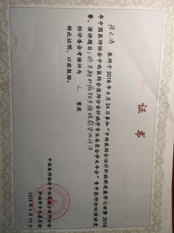 | 2018年 | 中国医师协会中西医结合医师分会肝病学专业委员会 | “中西医结合治疗肝病新进展学习班暨2018年中国医师协会中西医结合医师分会肝病学专业委员会学术年会”青年医师论坛演讲竞赛三等奖 |