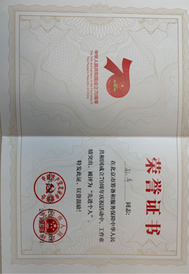| 2019年 | 北京市委市政府 | 北京市筹备和服务保障中华人民共和国成立70周年庆祝活动先进个人 |