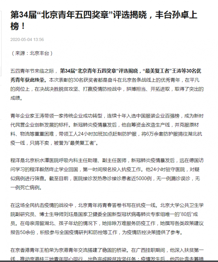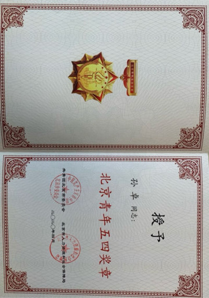 | 2020年 | 北京团市委、北京市人力资源和社会保障局 | 北京青年五四奖章 |