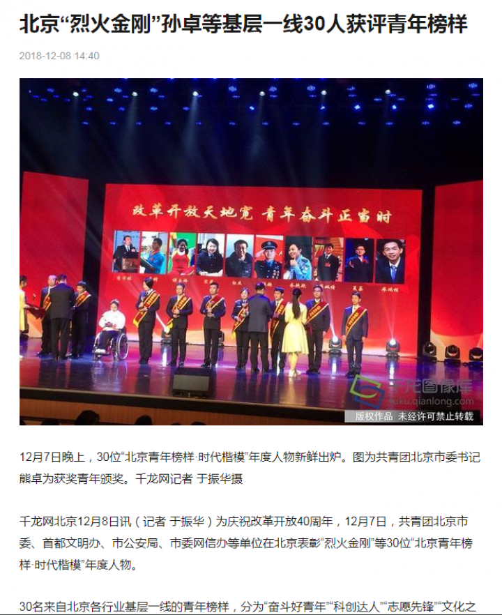 北京市丰台区消防救援支队方庄特勤站副站长、二级指挥员孙卓,在时刻面临生死考验的灭火救援一线,一待就是14年。这些年,他参加的救援有1500多次,抢救和转移被困群众有300多人,战功赫赫3次立功,被授予“北京青年五四奖章”、“北京青年榜样﹒时代楷模”年度人物、“应急先锋·北京榜样”年榜人物、“北京市筹备和服务保障中华人民共和国成立70周年庆祝活动先进个人”,但消防员的初心使命在他心中,始终未变!作为北京青年榜样宣讲团成员,孙卓先后走进高校、社区、企业讲述消防故事,传播正能量,开展党的十九大及五中全会精神宣讲20余次,线上线下覆盖青年超过10人,榜样模范作用凸显。