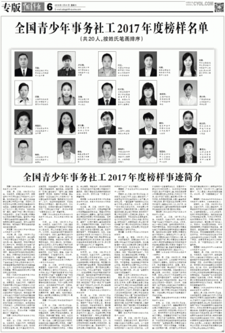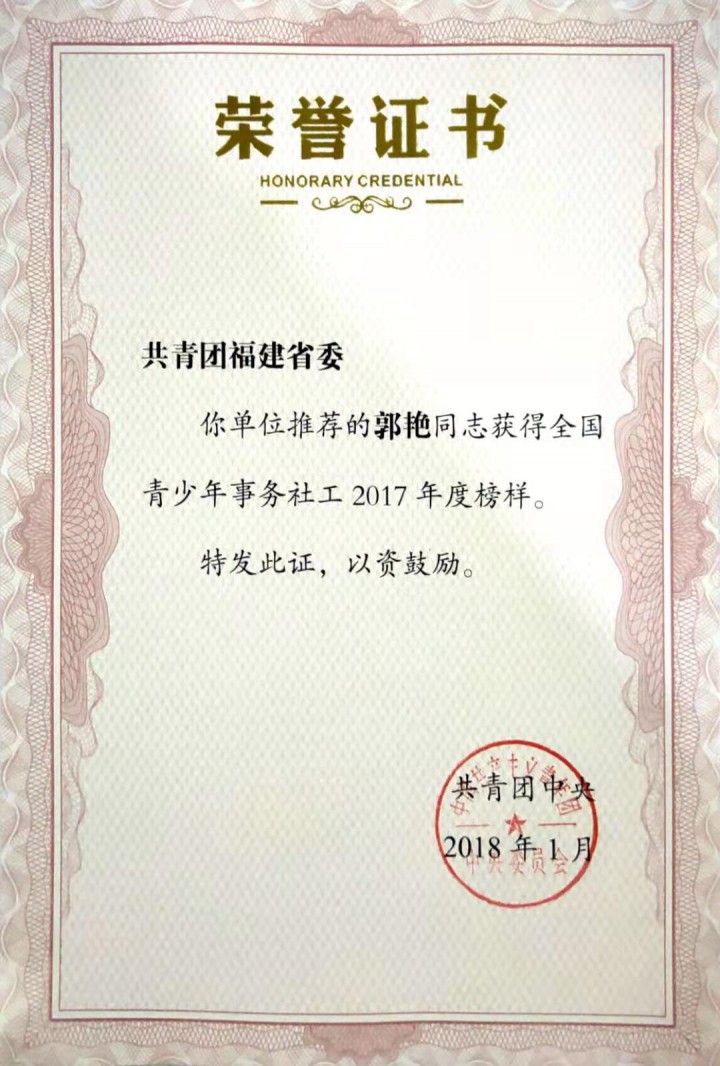 | 2017年 | 共青团中央 | 全国青少年事务社工2017年榜样 |