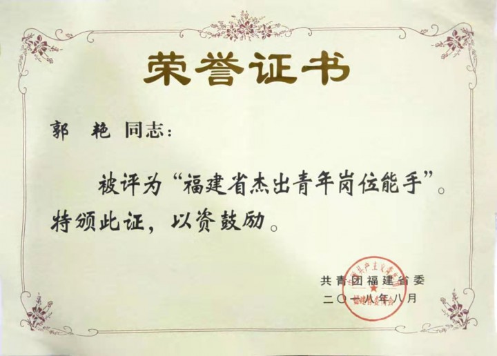 | 2018年 | 共青团福建省委 | 福建省杰出青年岗位能手 |