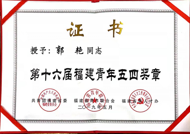| 2019年 | 共青团福建省委、福建省青年联合会、福建省人才办 | 第十六届福建青年五四奖章 |