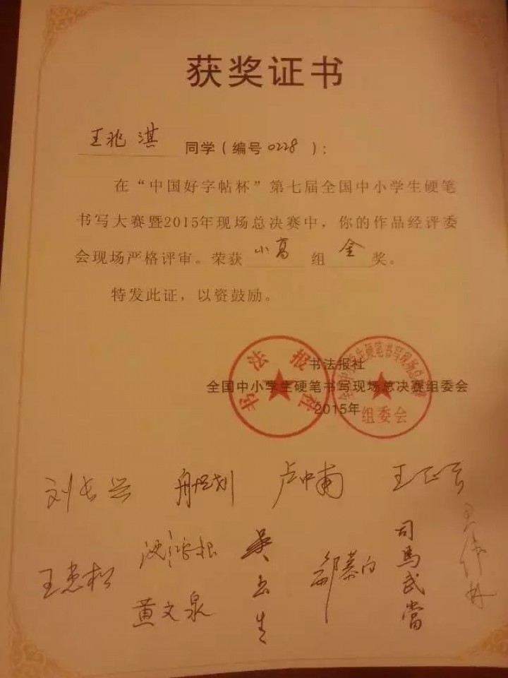 | 2015年 | 全国中小学生硬笔书写现场总决赛组委会 | 小高组金奖 |