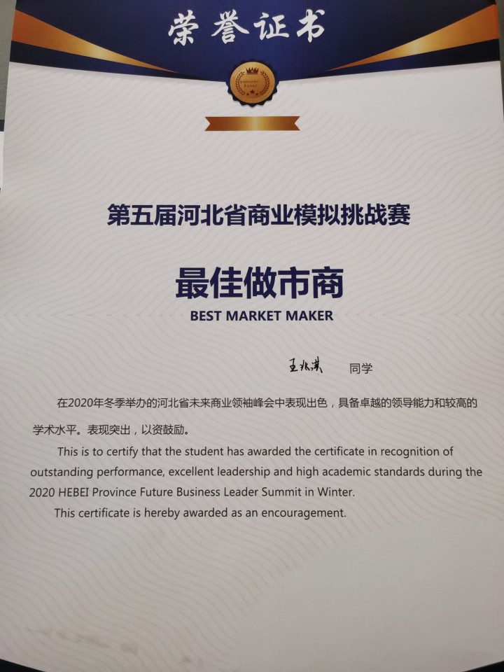 | 2020年 | 河北商盟 | 第五届商业模拟挑战赛最佳做市商 |