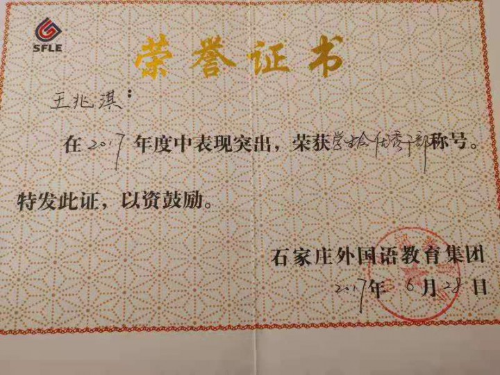 | 2017年 | 石家庄外国语教育集团 | 学生会优秀干部 |