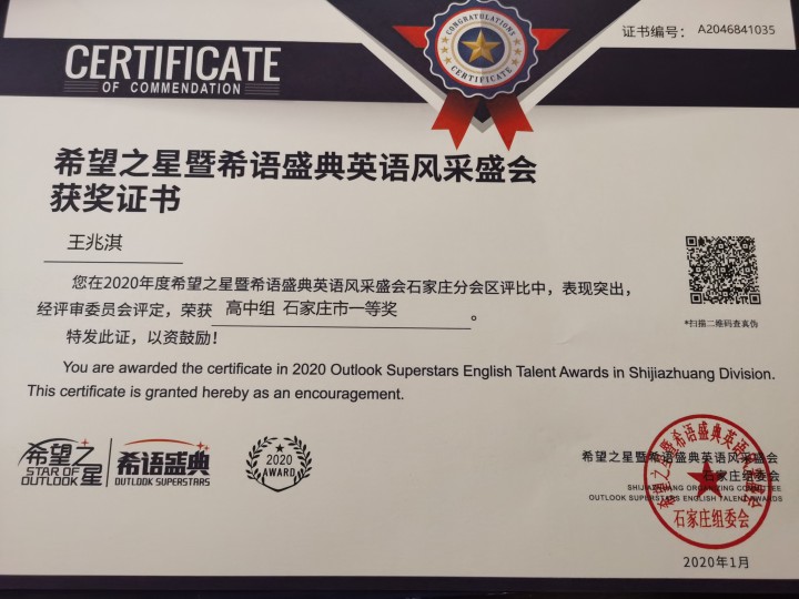 王兆淇同学成绩优异,勇于挑战,在求学的每个阶段都为自己设置一个更高的标准,不断向新目标进取,不断超越自己。小学从县里转到市里,中学考入省城外国语学校。每一次环境的改变,她都能克服困难,尽快适应新环境,跟上新学校的节奏,成绩渐入年级前茅。11岁离开父母和家乡,独自在外求学,5年多的住宿生活培养了她坚强独立、乐观向上的性格,从不抱怨生活艰苦,即使青春期思想波动,成绩有起伏,她也始终坚持信念,自我调整,强化训练,因为她坚信,与强者同行,必须时刻保持奋斗的姿态,否则不进则退!逐渐找到自己的优势,考进石家庄外国语学校高考保送班,目前正在努力冲刺全国顶尖大学。