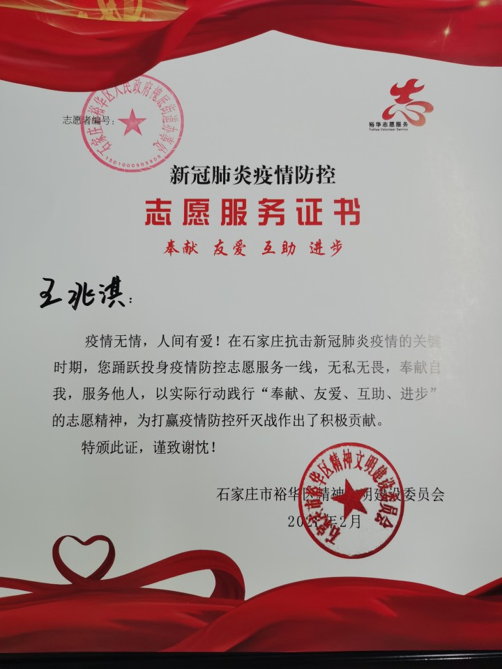 王兆淇同学不畏艰险,勇于奉献,在石家庄、邢台疫情期间为抗疫工作做出积极贡献。2021年元旦期间,石家庄、邢台先后出现新冠疫情,一个是她上学的城市,一个是她的家乡。她从石家庄返回邢台,度过隔离期后,立即申请加入抗疫志愿者队伍,从测量体温、登记出入人员、为隔离人员送药、买菜、倒垃圾等小事做起,用自己的实际行动,服务、帮助社区群众。返回石家庄后,又积极加入裕华区抗疫工作中,有了在邢台的工作经验,工作起来更加得心应手。在抗疫志愿活动中,她主动向医护人员、人民警察、社区工作人员学习,更加深刻地体会到什么是奉献、友爱、互助、进步,既是对自己的考验,也收获了无尽的感动。
