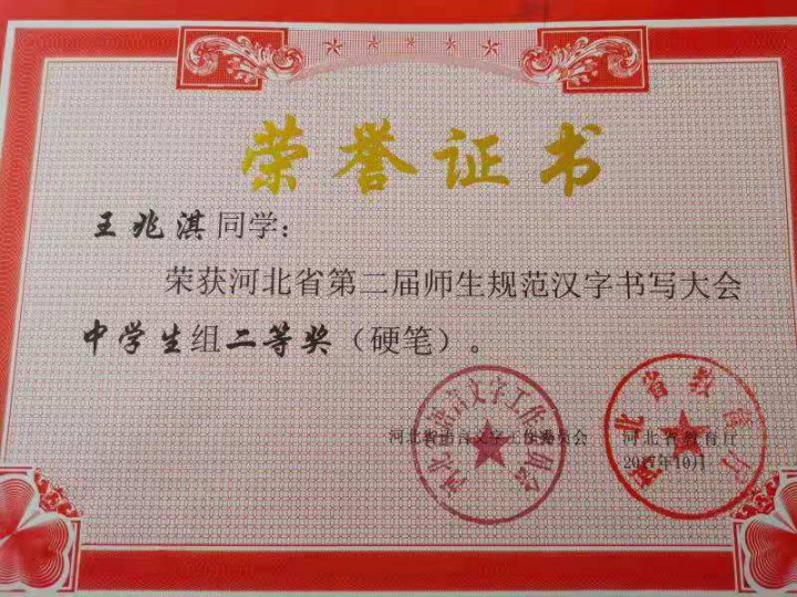 | 2017年 | 河北省教育厅 | 河北省第二届师生字书写大会中学生组二等奖 |
