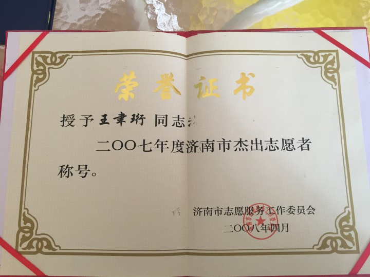 | 2008年 | 济南市志愿者服务工作委员会 | 2007年度济南市杰出志愿者 |