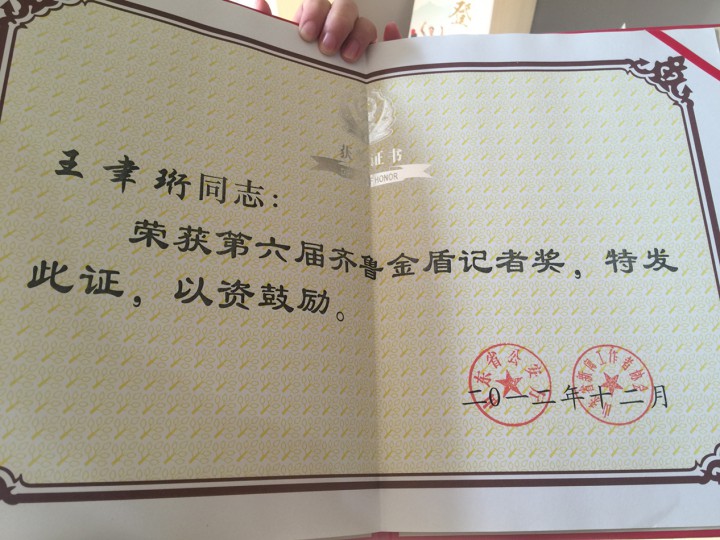 | 2012年 | 山东省公安厅、山东省新闻工作者协会 | 第六届齐鲁金盾记者奖 |