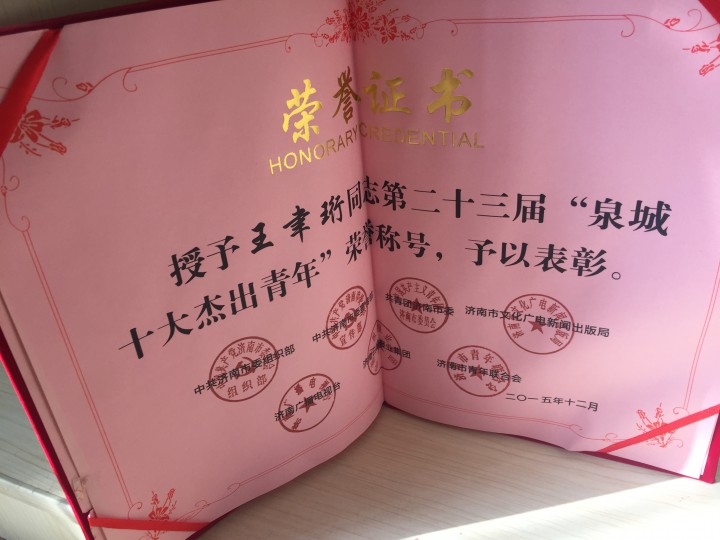| 2015年 | 中共济南市委组织部、中共济南市委宣传部、共青团济南市委、济南市文化广电新闻出版社、济南广播电视台、济南日报报业集团、济南市青年联合会 | 第二十三届“泉城十大杰出青年” |
