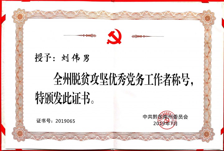 | 2019年 | 中共黔东南州委 | 黔东南州脱贫攻坚优秀党务工作者 |