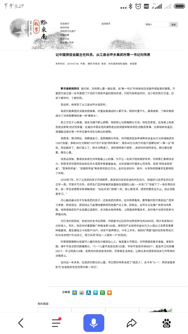 刘伟男同志不忘初心、牢记使命,主动申请前往贵州省从江县谷坪乡高武村驻村帮扶,带动55户贫困户269人高质量脱贫,整村出列。