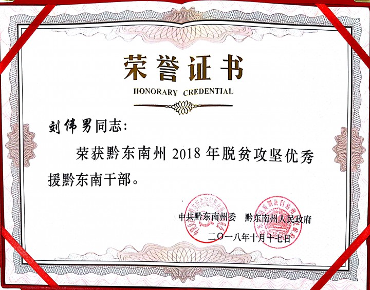 | 2018年 | 中共黔东南州委 | 黔东南州脱贫攻坚优秀援黔干部 |