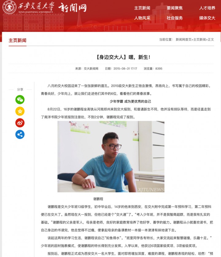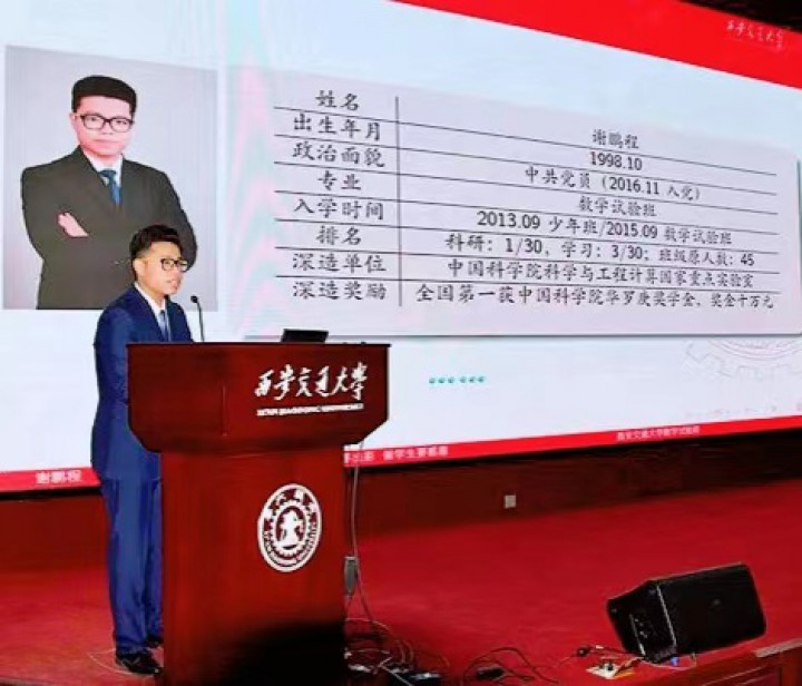 谢鹏程,22岁,中科院计算数学专业硕博连读生,学生会主席、党支部书记、SIAM学会中科院学生分会主席。14岁考入西交大少年班,品学兼优。获北京市三好学生、中科院优秀团员、学生标兵、彭康三活跃人物、华罗庚奖学金、国家奖学金、教育部珠峰奖学金;屡获优秀干部、优秀党员;22次国家和国际学科竞赛奖;论文5篇,专利1项;参与3项美国科学基金委项目,成果在ACC发表。被搜狐网、中国科学报、科学网等多次报道。