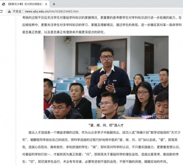 三、同学眼中“开拓先锋”:勇于开拓创新,积极传播数学,用不止脚步引领学习成才新风尚。勇于开拓创新,积极建言献策,搭建学研平台。2015年,在西交大庆祝少年班创办30周年活动中,设计的少年班班徽获特等奖,并被定为庆典专用徽标。2017年,发起、创刊了《珠峰报》,并请时任授课老师著名北大教授丘维声题写刊名。2018年,作为首任主席,创建了西交大钱学森书院学生会。2020年,成立了“博士讲堂”学术研讨小组。为国际SIAM学术交流平台撰写、发布了《走在数学最前沿,践行科技强国梦》报告。