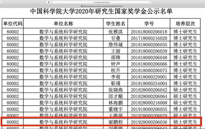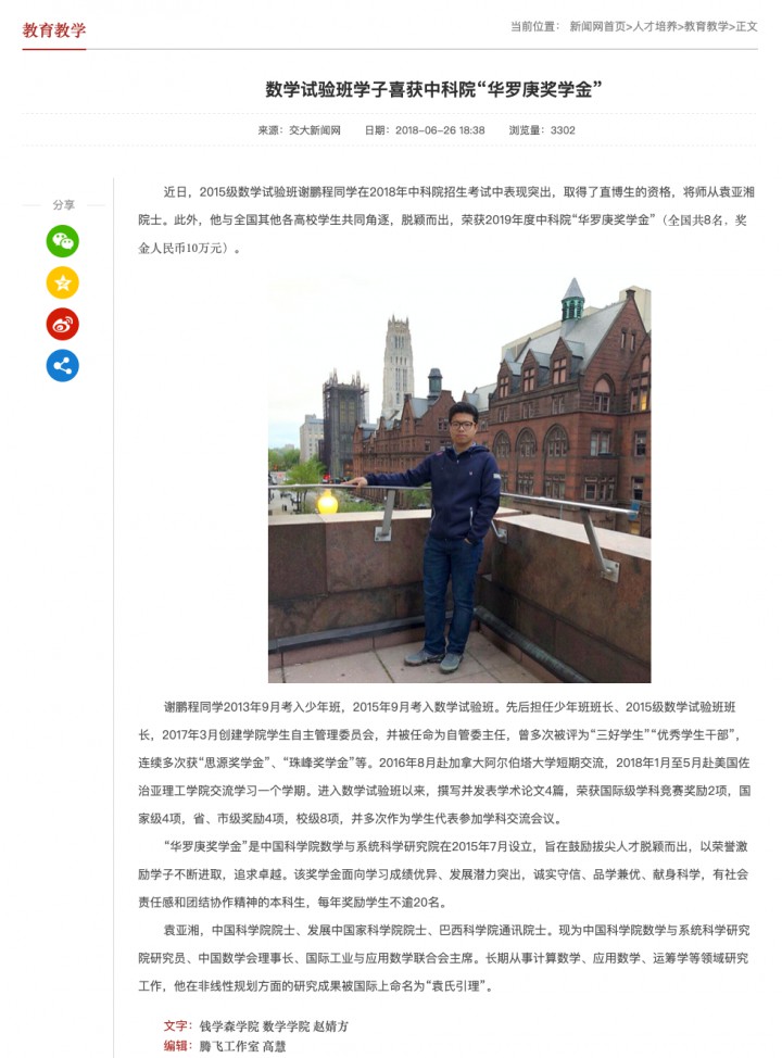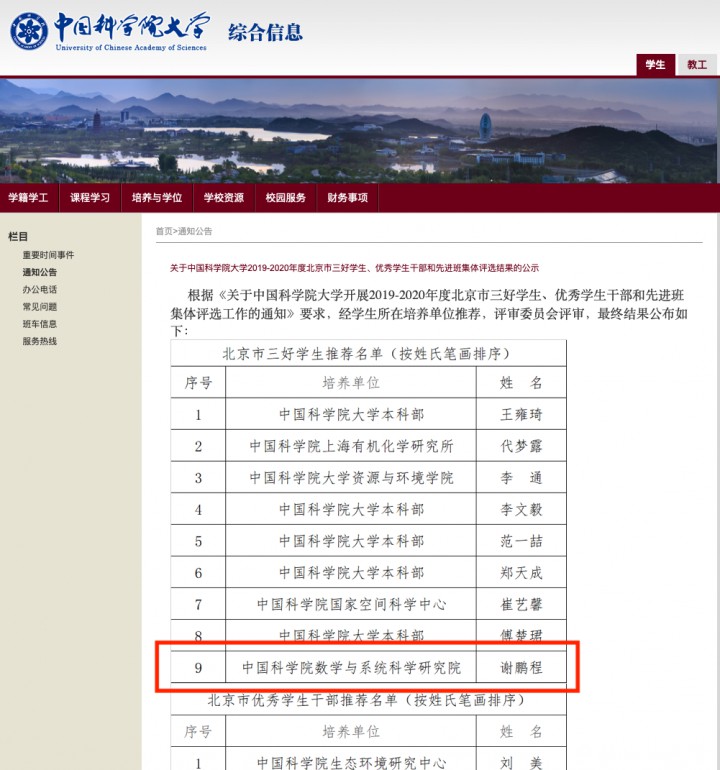 谢鹏程,男,1998年10月生,中国科学院数学与系统科学研究院计算数学专业硕博连读生,学生会主席、党支部书记、国际SIAM学会中科院学生分会主席、学院疫情防控领导小组成员。14岁考入西安交通大学少年班,教育部珠峰计划拔尖人才。他思想纯正上进,学习勤奋拔尖,体魄强健有力,素质全面出色,被誉为“珠峰少年”“全能学霸”。曾获北京市三好学生、中科院优秀团员、十大学生标兵、彭康“三活跃”人物;获中科院华罗庚奖学金、国家奖学金、教育部珠峰奖学金、“感恩近现代科学家”奖学金等各类奖学金13次;多次被评为三好学生、优秀学生干部、优秀共产党员等;22次获国家、国际级学科竞赛一、二等奖;发表论文7篇(其中学科论文5篇、研讨类2篇),申请专利1项;公派赴美交流期间,参与3项美国国家科学基金委项目,成果在ACC发表。获校级及以上德育文体类奖励80余次。其勤学上进事迹被搜狐网、中国科学报、科学网、中国科学院官网、国科大笃志网、西交大官网等报道。事迹如下: