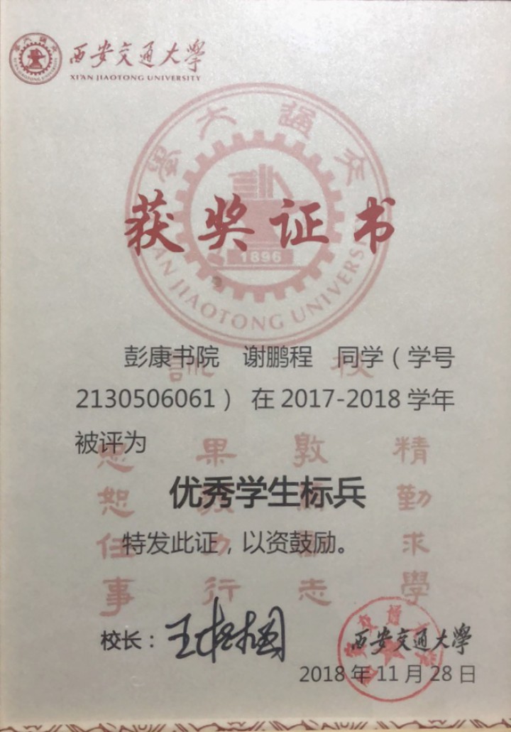 | 2018年 | 西安交通大学 | 十大学生标兵 |