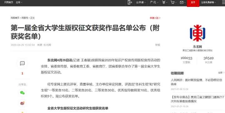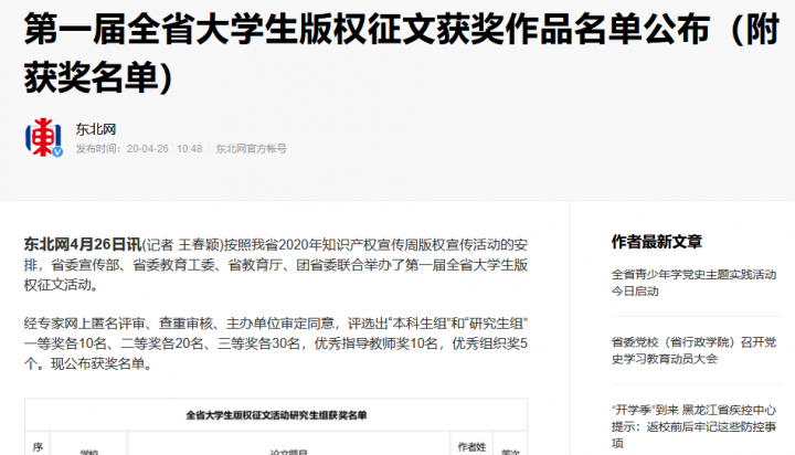 | 2020年 | 国家版权局 | 第十二届全国大学生版权征文比赛 |