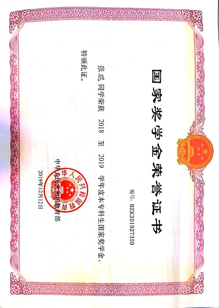 | 2019年 | 中华人民共和国教育部 | 国家奖学金 |