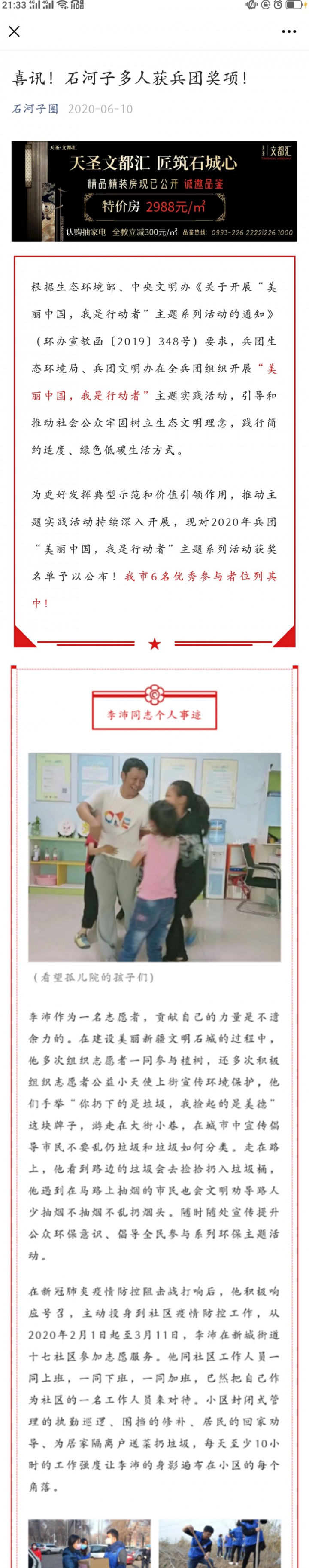 | 2020年 | 兵团生态环境局 | 兵团十大最美生态环保志愿者 |