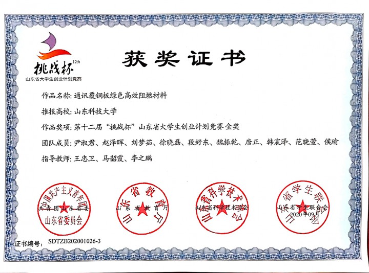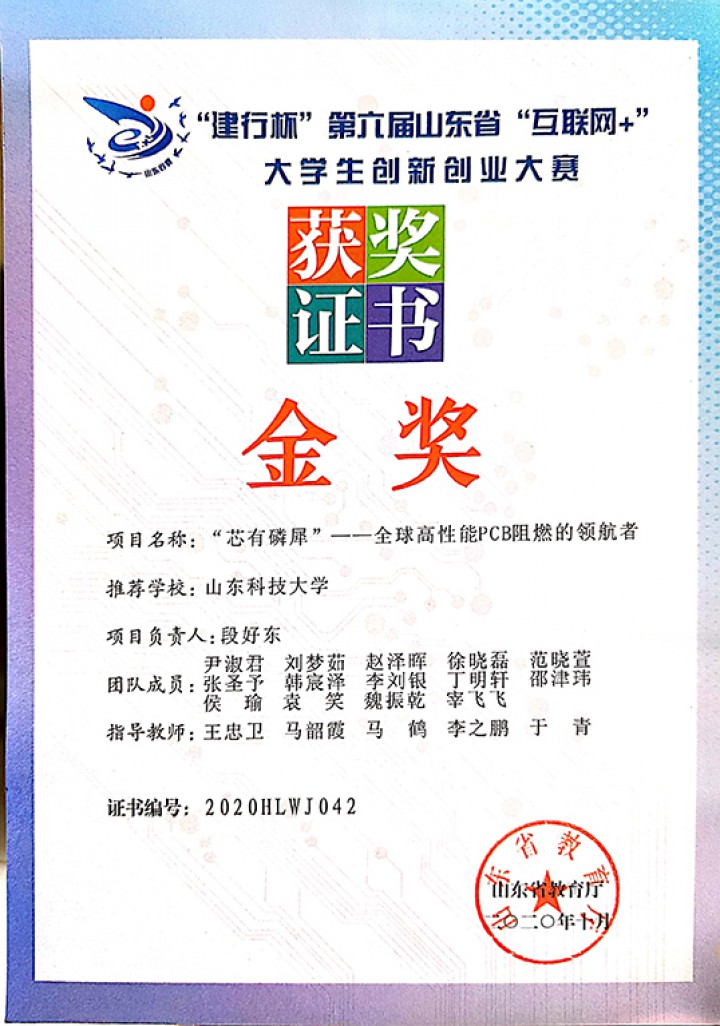 | 2020年 | 山东省教育厅 | 第六届山东省 “互联网+”创新创业大赛金奖 |