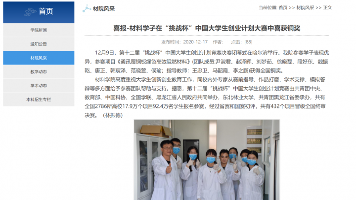 | 2020年 | 共青团中央 | 第十二届中国“挑战杯”大学生创业计划竞赛铜奖 |