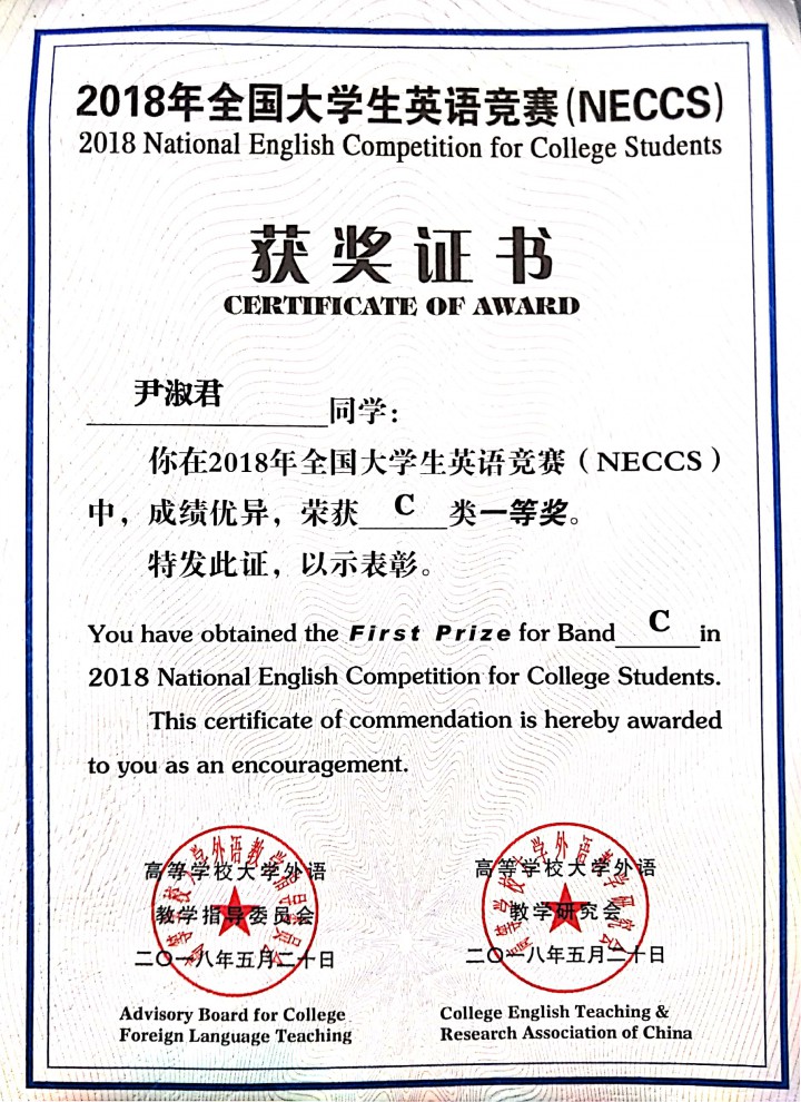 | 2018年 | 高等学校大学外语教学指导委员会、高等学校大学外语教学研究会 | 全国大学生英语竞赛一等奖 |