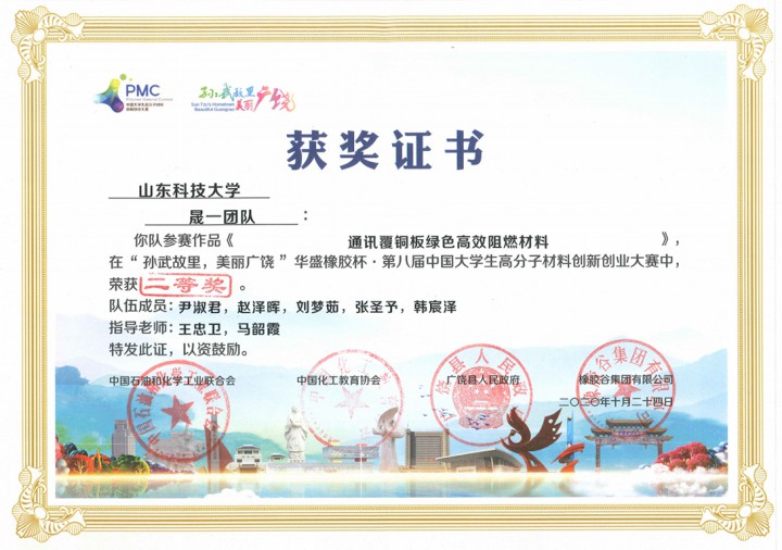 创新创业,也是尹淑君在大学里探索的重要方向。2019年她带领团队开展了《纺丝级无卤阻燃聚酯母粒》项目的创业实践,前后获得第五届山东省互联网+创新创业大赛铜奖、中国长寿之乡杯第七届中国大学生高分子材料创新创业大赛铜奖、山东省高分子实用技术大赛铜奖。这几次止步于铜奖,让尹淑君对自己有了更高的要求。她明白,要想夺取金奖,只能建立在踏实学习的基础上,要达到既定的目标,就需要一步步踏踏实实地去历练。在参加青岛市大学生创业培育“海鸥行动”训练营期间,她常常向获过奖的学长学姐请教,去实习企业现场仔细学习,抓住每一次辅导讲座……今年,尹淑君把课题组多年的研究成果带到了山东省赛的舞台上,带领团队开展《通讯覆铜板绿色高效阻燃材料》项目的研究和落地。经历了10次晋级赛、18次专家打磨,积累了超千分钟的辅导音频、小半本的专家打磨建议,又经过上百遍演讲练习、日日夜夜修改……最终斩获中国挑战杯大学生创业计划大赛铜奖(山东省金奖)、第六届山东省互联网+竞赛金奖。