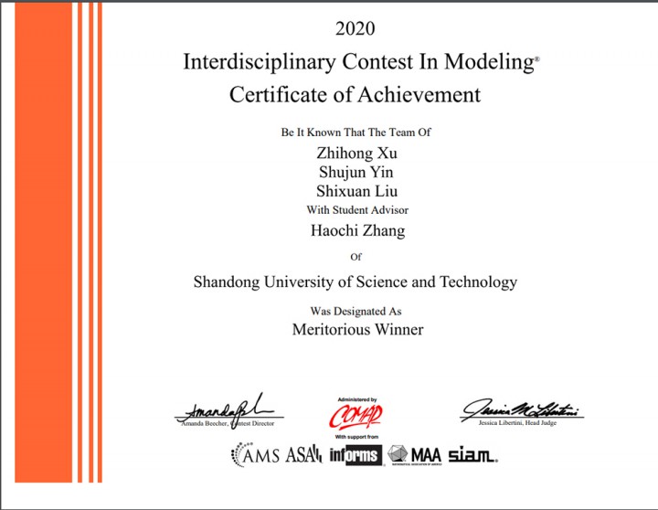 | 2019年 | the Consortium for Mathematics and Its Applications (COMAP) | 美国大学生数学建模竞赛M奖 |