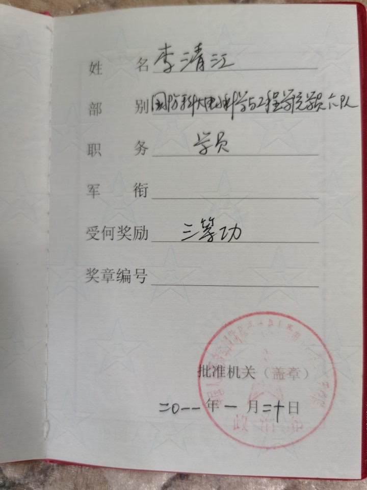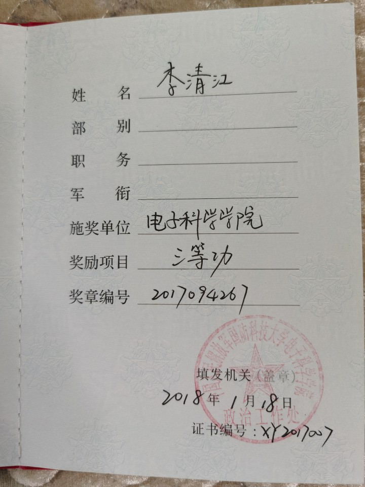李清江,男,1986年2月出生,2004年9月入伍,现为国防科技大学电子科学学院某系副主任、副研究员,专业技术中校、技术九级。先后荣获第八届全国大学生电子设计竞赛最高奖“索尼杯”、第五届中国大学生创新设计竞赛全国一等奖和唯一最佳创意奖、军队科技进步三等奖(排名2)、2017年湖南省优秀博士论文奖、国防科技大学青年创新奖一等奖,入选2020年度军队高层次科技创新人才工程首批青年科技英才,国防科技大学青年拔尖人才、卓越青年培养对象、学习成才先进个人、优秀共产党员、践行当代革命军人核心价值观新闻人物。荣立个人二等功1次、三等功2次。