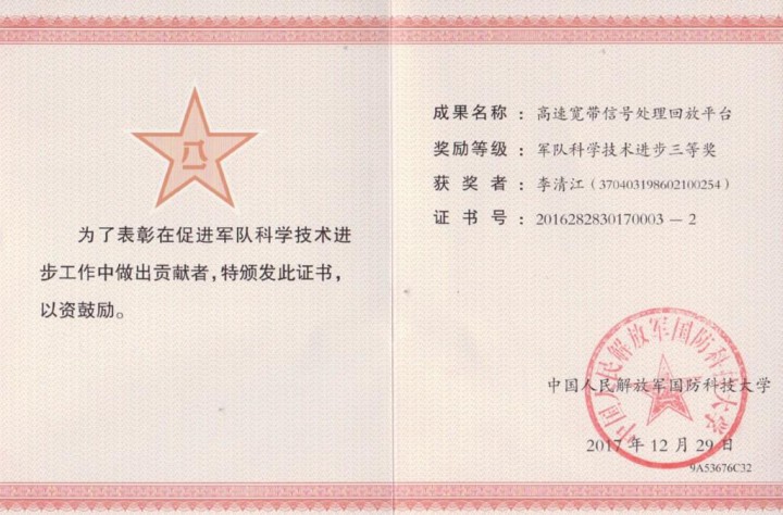 | 2017年 | 国防科技大学 | 军队科学技术进步三等奖 |