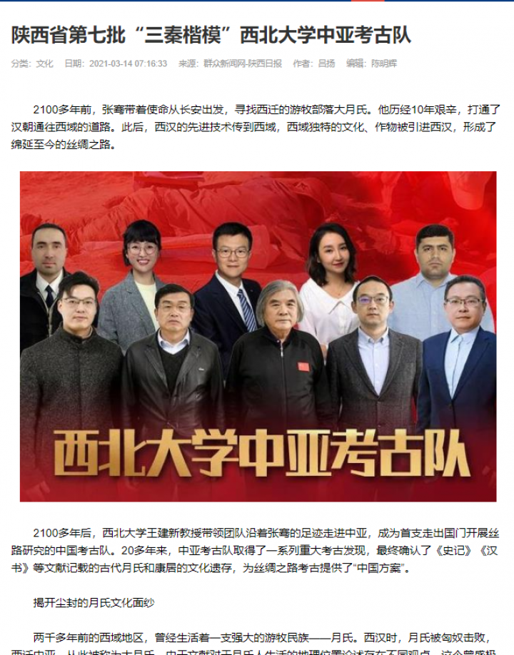 西北大学中亚考古队是由8名教师和12名学生为骨干力量组成的一支优秀科研团队,他们爱党爱国,积极融入“一带一路”建设;孜孜以求,坚定推进中国考古“走出去”,把中国游牧文化考古理论和实践带入国际领先水平,确认了《史记》《汉书》等文献记载的古代月氏和康居的文化遗存,为丝绸之路考古提供了“中国方案”,鲜活诠释了新时代高校知识分子的使命和担当。西北大学中亚考古队的队员们坚守初心、知识报国,牢记使命、传播文明,潜心研究、团结协作,二十年如一日,接续奋斗,用青春、知识与汗水绘就了丝绸之路考古“中国方案”,在服务“一带一路”国家战略的生动实践中有力诠释了新时代科学家精神和新时代高校知识分子的爱国情怀。