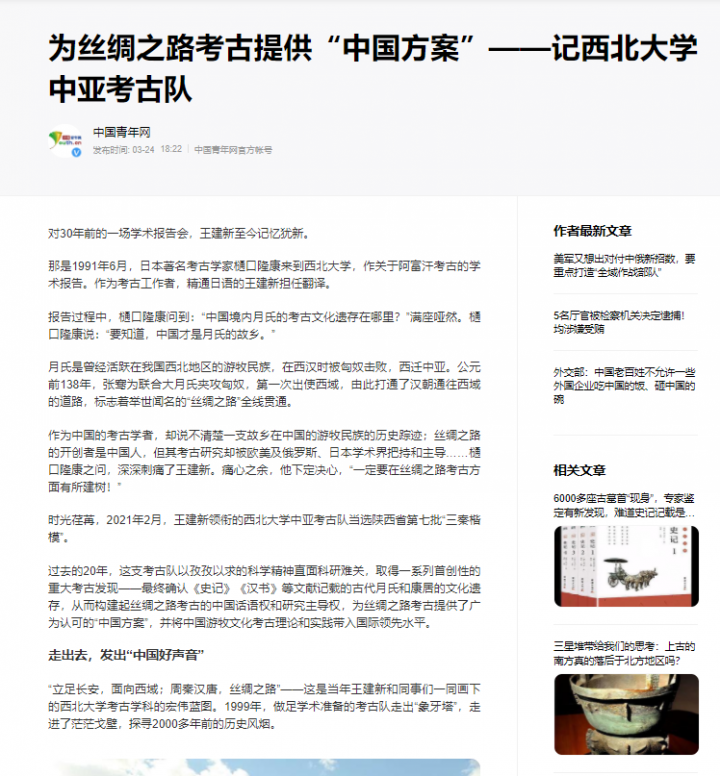 20年来,中亚考古队紧跟党和国家推进“一带一路”建设的时代步伐,以古丝绸之路起点西安为原点,手持考古铲,一铲一铲往下挖,用双手书写出精彩的文明篇章,用脚步丈量出坚韧不拔的精神,考古队中的青年学生党员唐云鹏就是这样的代表,他长期坚守在丝路考古的田野一线,克服艰苦的野外条件,秉承热爱考古的初心,为中国考古走出国门、弘扬优秀中国传统文化、恢复丝绸之路沿线历史风貌贡献青春力量。