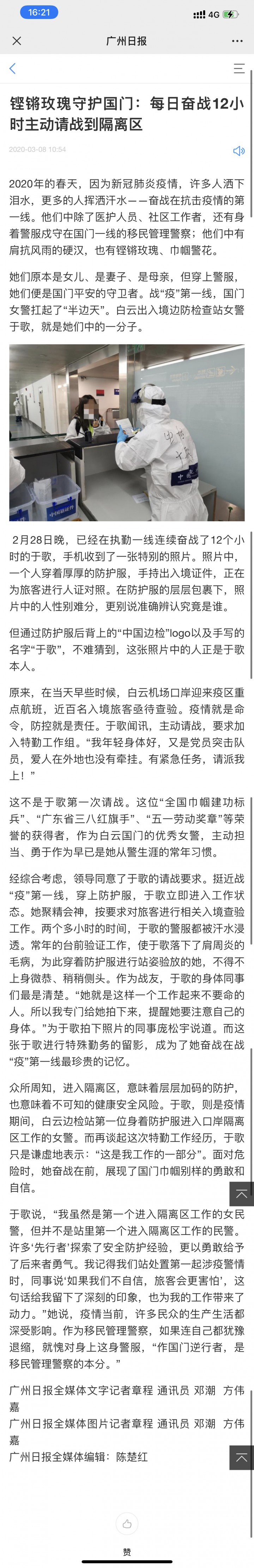 新冠肺炎疫情暴发后,于歌主动请战加入“党员突击队”,承担来往疫区重点航班的查验任务。作为广州边检总站第一位身着防护服,进入隔离区负压仓“零距离”验放疑似确诊旅客的女民警,于歌始终战斗在“外防输入”的第一线。面对华南第一空港复杂的旅客成分和不断升级的防疫工作要求,于歌总说“自己年轻身体好”,但医生却不这么说:“去年1月,我看了于歌在医院拍的胸片,呈现出的状况很不乐观,就连三甲医院的老教授都无法排除她感染肺结核的可能性,医生给她开的方子全都是最强效的抗生素,其中的副作用可想而知……”