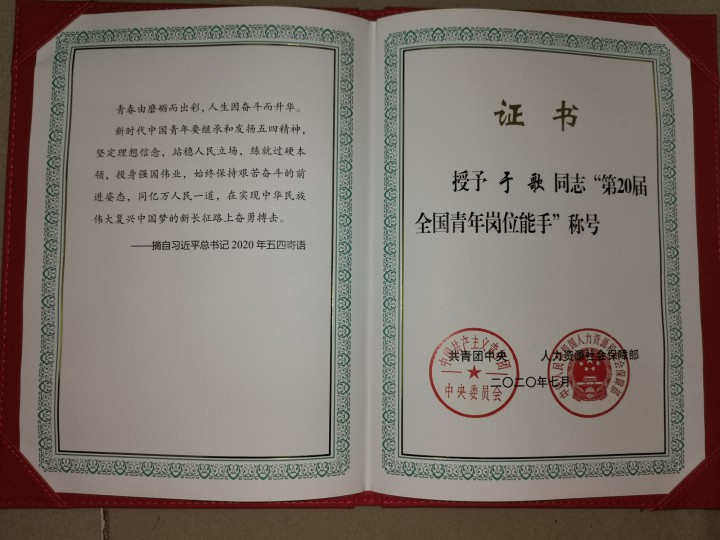 | 2020年 | 共青团中央和人力资源社会保障部 | 全国青年岗位能手 |