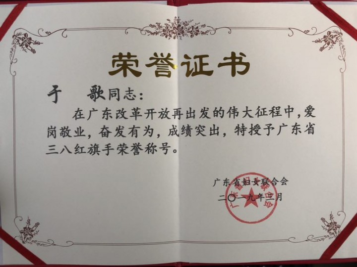 | 2019年 | 广东省妇联 | 广东省三八红旗手 |
