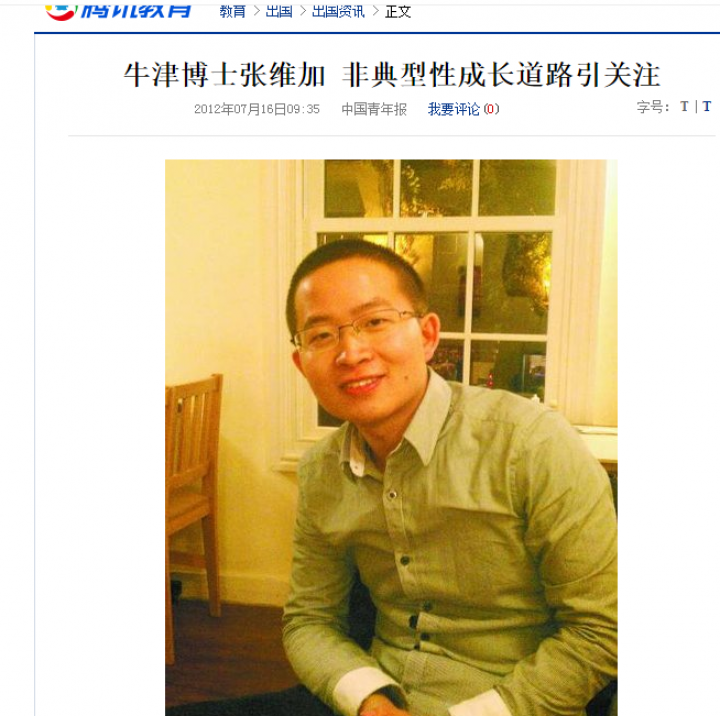 张维加曾是2004年杭州市状元。曾两次获得人民日报的采访与报道。2011年从北京大学以北京大学理科实验班绩点第一名毕业,获北京大学共青团委颁2010年北京大学年度之星,由元培导师陈十一校长与中国探月发起人欧阳自远院士写推荐信前往牛津大学读博士。在牛津与NASA期间,曾与微软开发团队有深度合作,是罕见的精通西方国家计算机与网络底层架构的中国人才,共计发表30余篇论文,其中6篇SCI论文(5篇一作),6篇EI论文,与16篇核心论文。张维加在小学二年级的时候开始学习计算机编程,师从作为浙大快威早期高工、技术核心骨干的父亲,至今已有二十年的计算机开发经历。在牛津大学期间,课题组主要为NASA卫星控制系统与数据处理系统工作。主办召集了多次会议包括AOGS2011会议与2016年欧洲CSS会议。